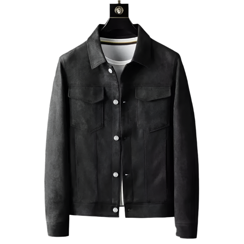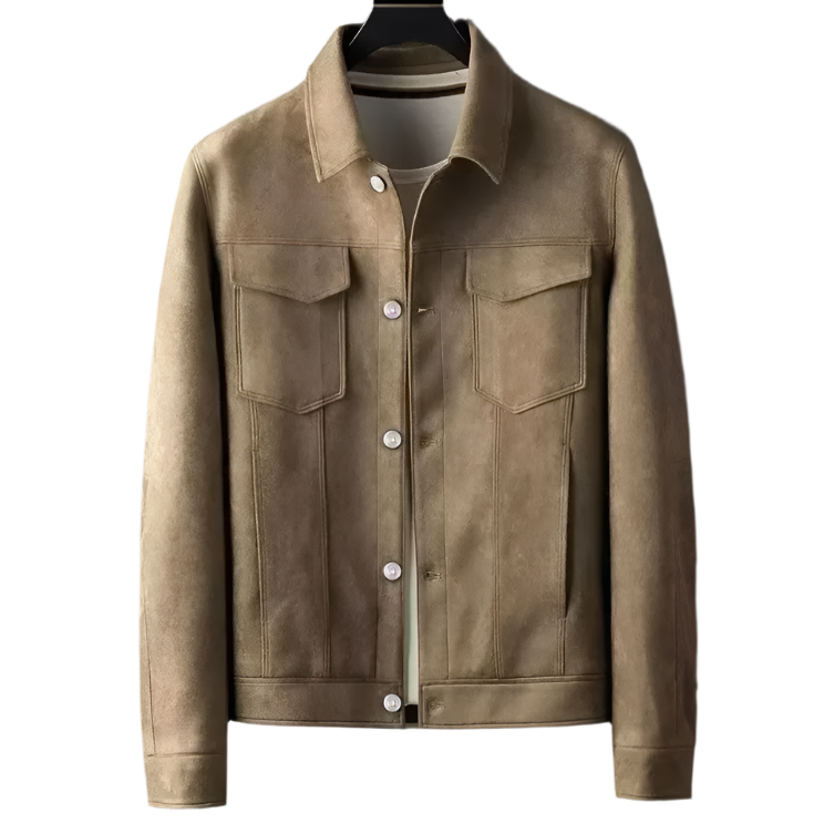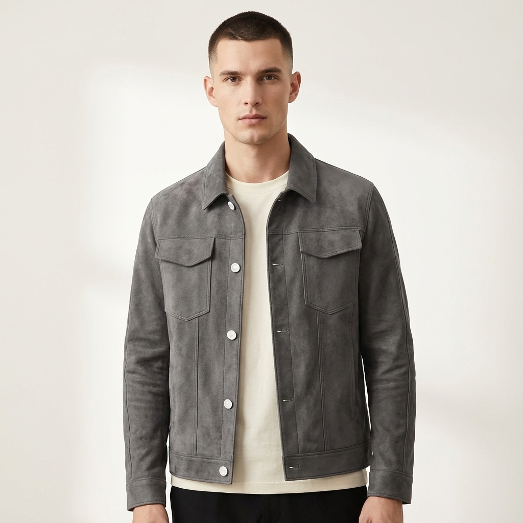 Crafted from supple suede with a smooth, velvety hand-feel, this jacket features clean paneling and a structured silhouette that gives it a confident, refined presence. Finished with classic snap buttons and thoughtfully placed pockets, it’s an easy statement layer that feels substantial, intentional, and built to be worn for years.