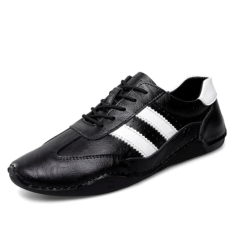 Embrace day-long ease with our flat walking shoes, featuring a timeless design with bold black accents. They’re made with genuine leather exterior, resilient rubber soles, and a soft, padded insole for comfort. Introduce these sneakers to your collection and they're sure to become your preferred choice for both style and comfort.